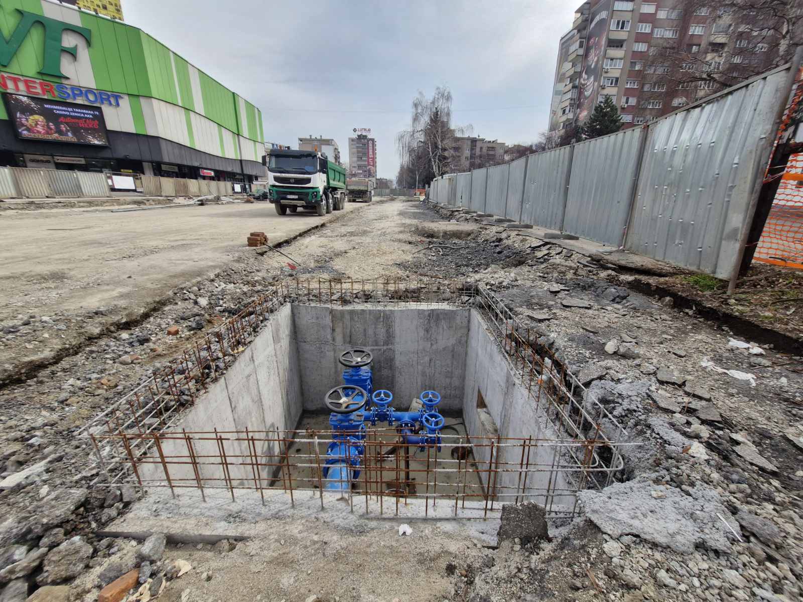 Radovi su nastavljeni izgradnjom priključne vodovodne liniju promjera DN 80 prema Bulevaru Ezhera Eze Arnautovića, a bit će izvršeno i izmještanje vodomjera iz obližnjih stambenih objekata na javnu površinu.